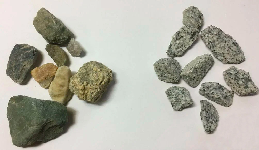 - Щебень (справа) – угловатые зерна с шероховатой текстурой, более однородные по размеру.